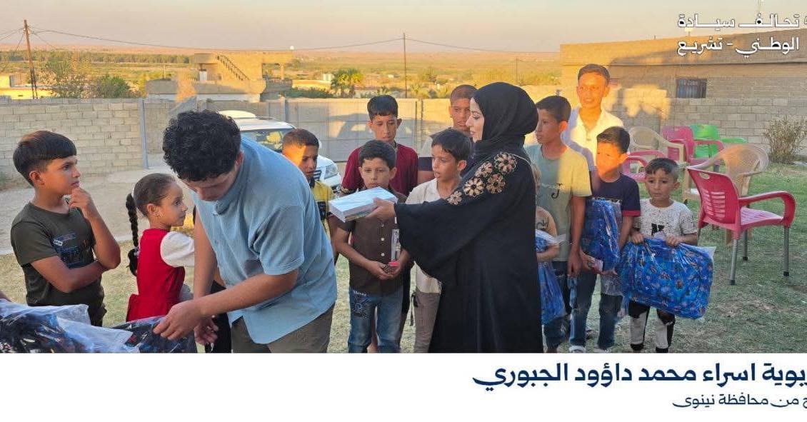 استمراراً بحملتها القيادية بتحالف سيادة الوطني تشريع الاستاذة اسراء الجبوري تشارك الاطفال فرحتهم بالعام الدراسي الجديد حيث قامت بتوزيع بعض من احتياجاتهم المدرسية من حقائب وقرطاسية لتخفيف بعض من عبء العوائل وتعزيز اواصر الترابط الاجتماعي .