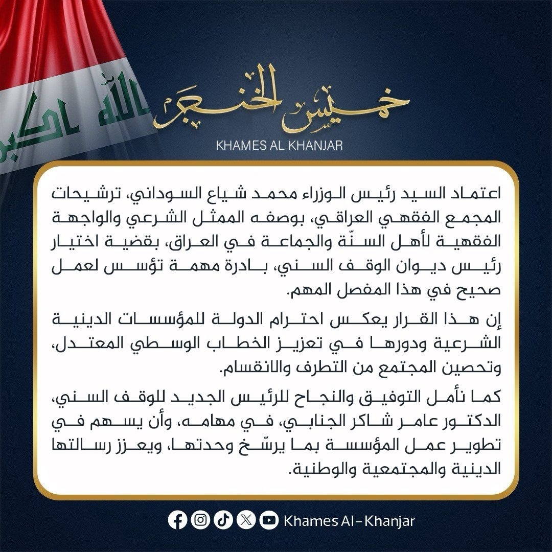 كما نأمل التوفيق والنجاح للرئيس الجديد للوقف السني، الدكتور عامر شاكر الجنابي، في مهامه، وأن يسهم في تطوير عمل المؤسسة بما يرسّخ وحدتها، ويعزز رسالتها الدينية والمجتمعية والوطنية.