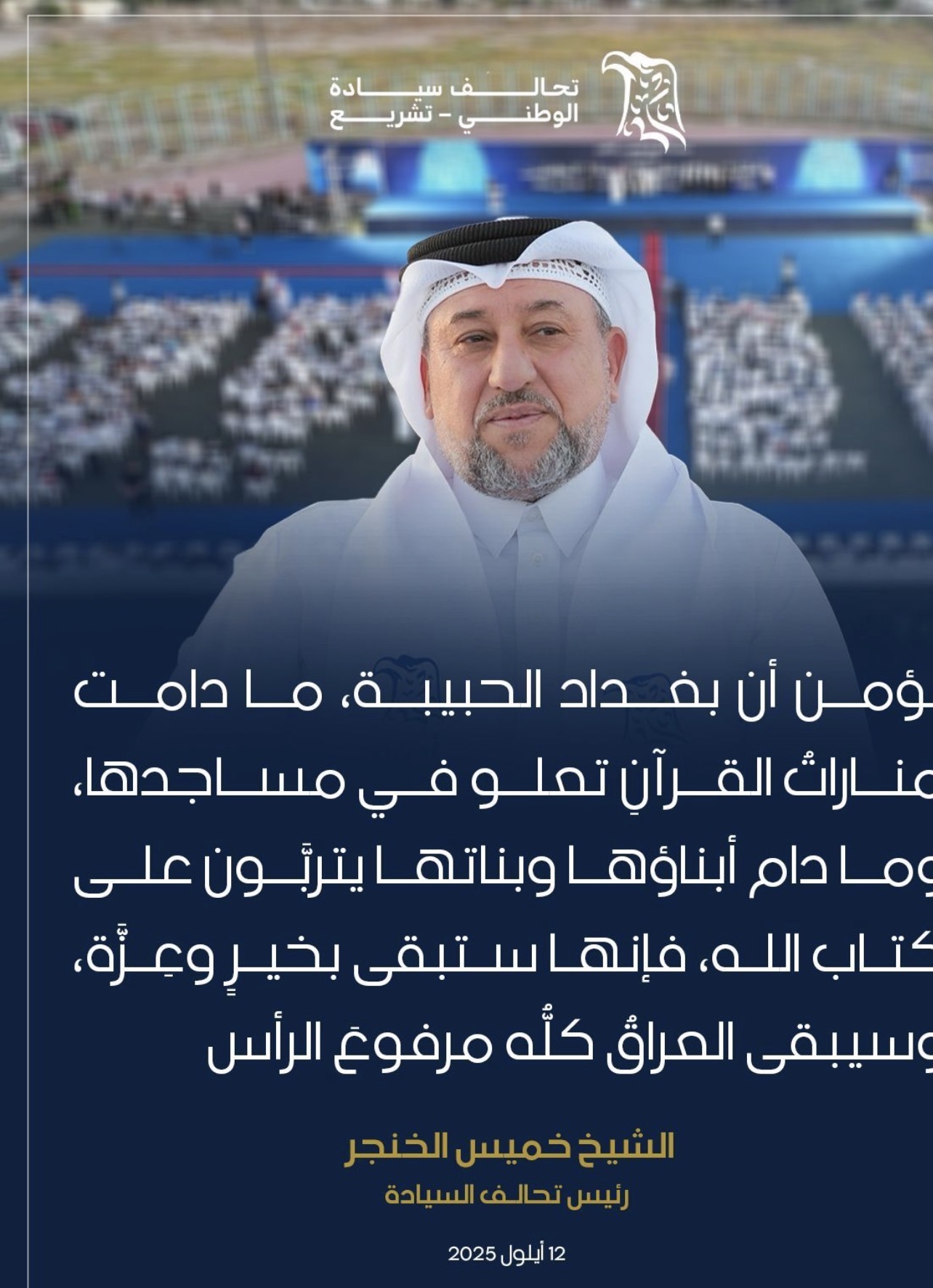 رئيس تحالف السيادة الشيخ خميس الخنجر: نؤمن أن بغداد الحبيبة، ما دامت منارات القرآن تعلو في مساجدها، وما دام أبناؤها وبناتها يتربون على كتاب الله، فإنها ستبقى بخير وعزة، وسيبقى العراق كله مرفوع الرأس.