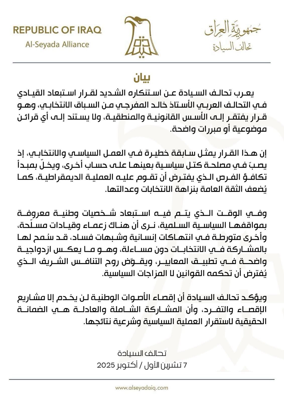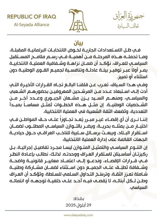 وبالوقت الذي نؤكد فيه أن خسارتنا بالشهيد صفاء لا تعوض، فإن تحالف السيادة يحمل الجهات المسؤولة عن الأمن في بغداد كامل المسؤولية عن هذا الخرق الخطير، ويدعو الحكومة إلى فتح تحقيق عاجل وشفاف لكشف الجهات التي تقف خلف الجريمة وتقديم الجناة إلى العدالة، صونا لهيبة الدولة وحماية لحياة الشرفاء الذين يخدمون وطنهم بإخلاص.