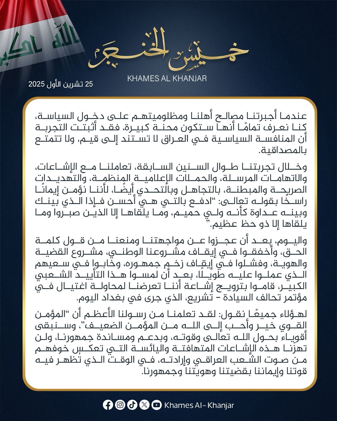 واليوم، بعد أن عجزوا عن مواجهتنا ومنعنا من قول كلمة الحق، وأخفقوا في إيقاف مشروعنا الوطني، مشروع القضية والهوية، وفشلوا في إيقاف زخم جمهوره، وخابوا في سعيهم الذي عملوا عليه طويلًا، بعد أن لمسوا هذا التأييد الشعبي الكبير، قاموا بترويج إشاعة أننا تعرضنا لمحاولة اغتيال في مؤتمر تحالف السيادة – تشريع، الذي جرى في بغداد اليوم.